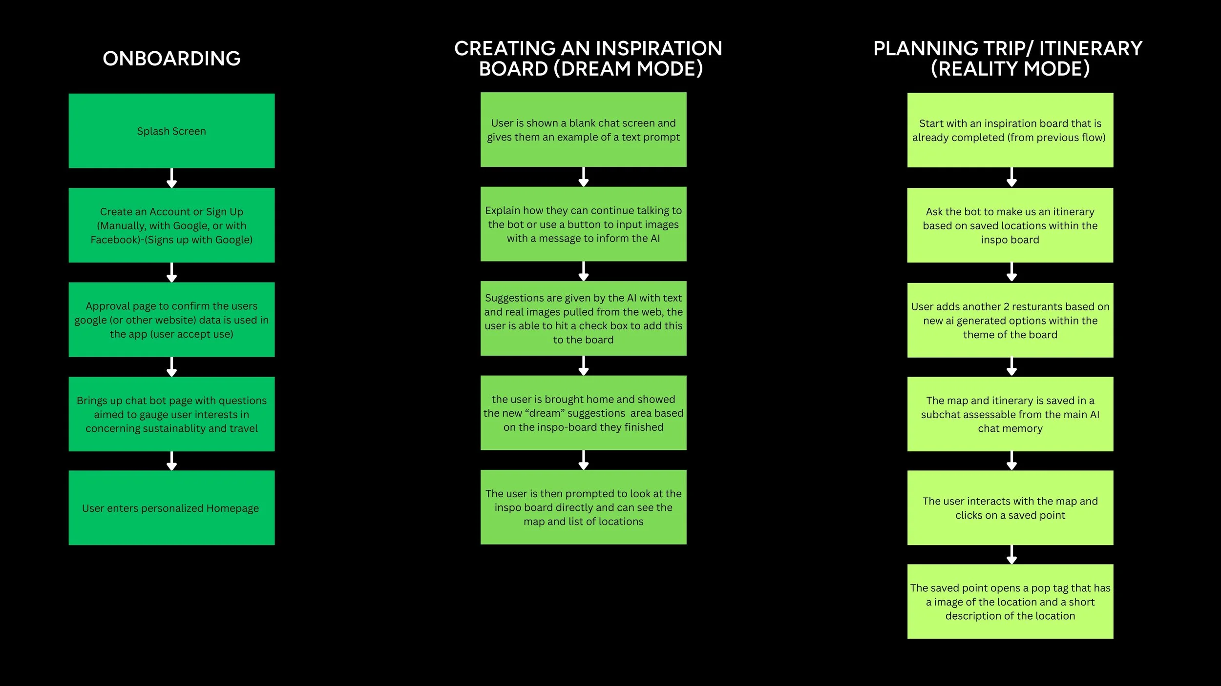 Focus on the user’s journey, from the moment they decide to travel to the outcome after using the app. Emphasize how highlighting sustainability and integrating generative AI can work together, while still including all the essential features users value in a travel app.